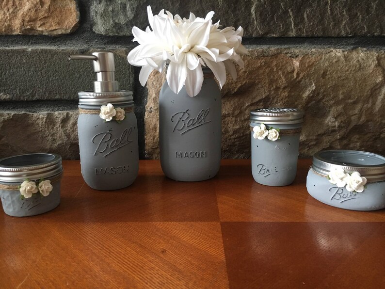 Mason jar bathroom apothecary jars set farmhouse decor qtip dispenser holder glass rustic vanity organizer with stainless steel lids for cotton swabs rounds bath salts ball black 2 pack. Mason jar bathroom setbathroom mason jarsmason jar decor soap dispensermason jar bathroom decorkitchen soap holderq tip holder daisymaedesignsco. 48 out of 5 stars 668.