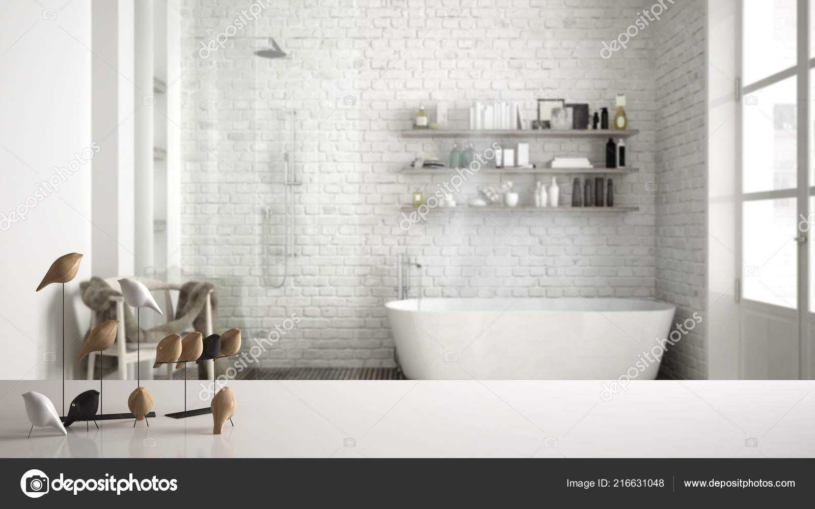 White Table Top Or Shelf With Minimalistic Bird Ornament Birdie Knick Knack Over Blurred Contemporary White Bathroom With Stock Illustration Illustration Of Empty Blurred 159524086