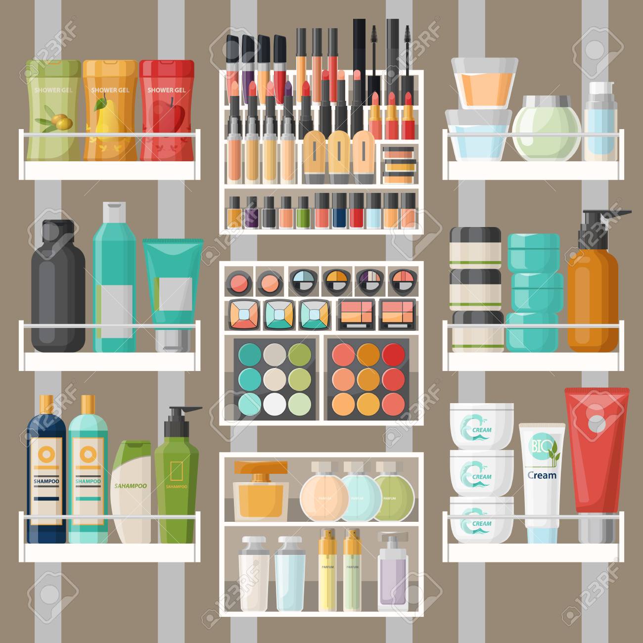 Bathroom Shelves With Skincare And Hygiene Bottles And Containers Royalty Free Cliparts Vectors And Stock Illustration Image 110462775
