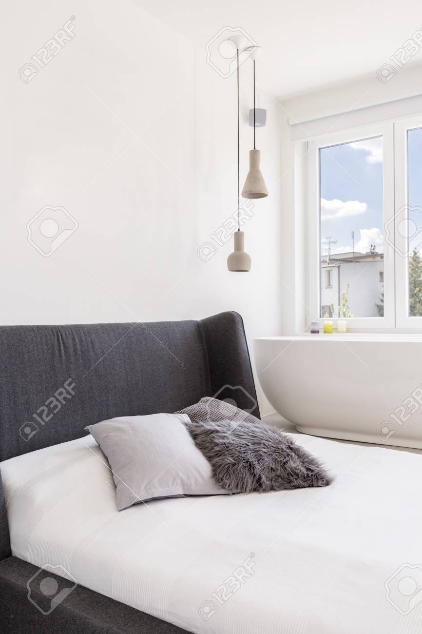 Badroom With White Walls And Grey Bed Stock Photo Picture And Royalty Free Image Image 67696112