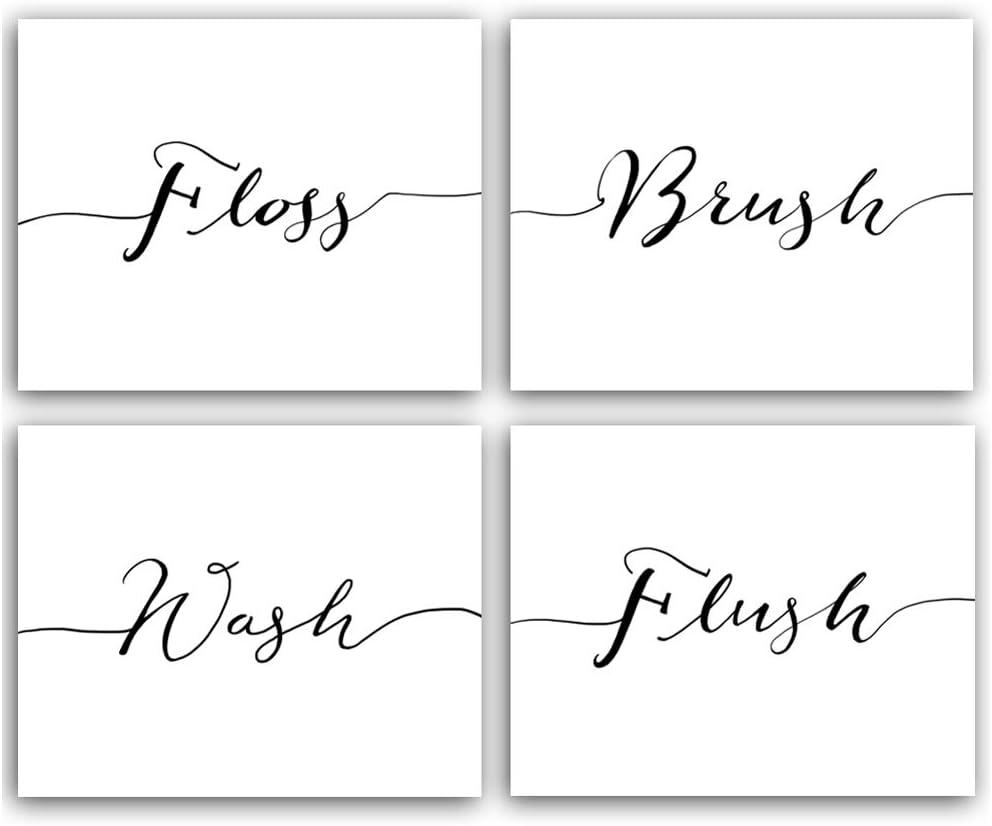 Funny Bathroom Themed Art Prints Floss Wash Brush Flush Words Quote And Sayings Canvas Black And White Washroom Signs Set Of 4 Poster 8 X10 Unframed Great Gift For Bathroom Decor Amazon Ca Home Kitchen