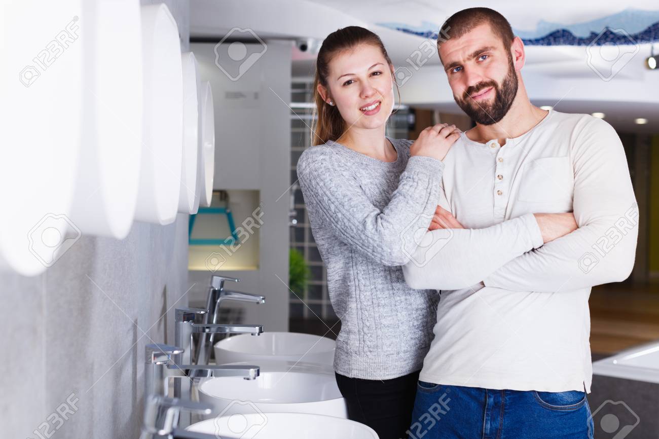 Young Family Couple Choosing Bathroom Sink In Bathroom Fixtures Stock Photo Picture And Royalty Free Image Image 97842610