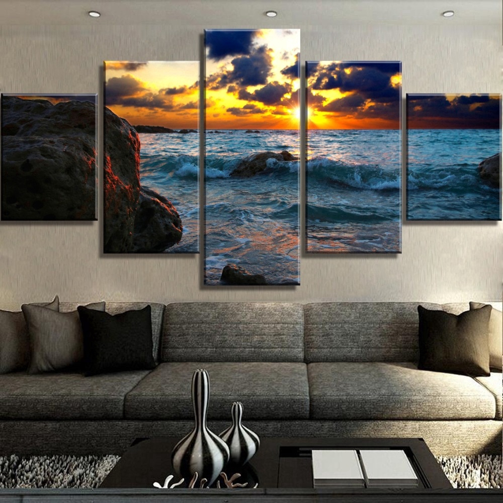 Unique Gift Hd Print Painting 5 Piece Sea Sunset Landscape Canvas Wall Art Home Living Room Decoration Shopee Indonesia